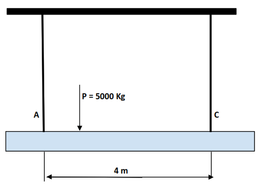Tenemos una barra apoyada por dos hilos. Uno es de Acero (punto A) y el otro de Cobre (punto C). Queremos colgar una carga de 5.000 kg.
